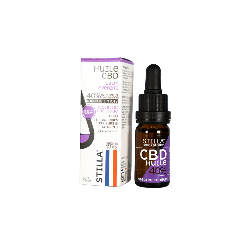 Imaginé et Fabriqué en France. Huile CBD 40% Calm Evening | 4000mg – THC < 0,2% – Full spectrum – Innovation STILLA®
